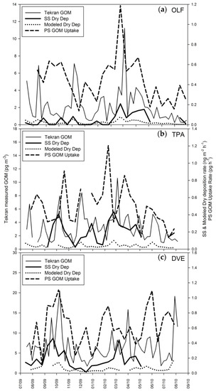 This figure shows data collected at three locations in Florida, USA: (a) Outlying Landing Field (OLF) near Pensacola, (b) Tampa (TPA), and (c) Davie (DVE) near Fort Lauderdale. Tekran system gaseous oxidized mercury (GOM) concentrations are presented, as are surrogate surface (SS) dry deposition measurements, modeled dry deposition using the Tekran system GOM data, and passive box samplers (PS) GOM uptake. From Atmospheric Chemistry and Physics, Peterson et al. [43]. https://www.atmospheric-chemistry-and-physics.net/policies/licence_and_copyright.html.