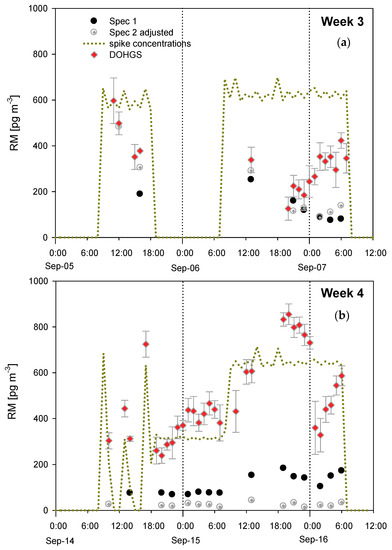 Hourly mean reactive mercury (RM) concentrations during Reno Atmospheric Mercury Intercomparison eXperiment (RAMIX) measured by two Tekran systems (Spec 1, Spec 2) and Detector for Oxidized mercury System (DOHGS) during HgBr2 spikes. (a) Week 3; (b) Week 4. During week 3, both Tekran systems were sampling from the manifold, whereas in week 4, only Spec 1 was sampling from the manifold. Spec 1 and Spec 2 data represent a single hourly measurement, and the DOHGS data represent a 1-hour average of measurement made every 2.5 min. The error bars on DOHGS data represent 1σ. Reprinted (adapted) with permission from [28]. Copyright (2013) American Chemical Society.