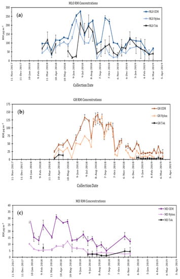 RM concentration data collected using Tekran system and RMAS 2.0 membranes (CEM and nylon) from November 2017 to March 2019 at 4 locations: Moana Loa, (MLO) Hawaii; Reno, NV (GH); and Piney Reservoir in Maryland (MD). (a) MLO; (b) GH (c) MD. Modified from Luippold et al. [48]. Each panel shows CEM and nylon membrane RM concentrations as compared to Tekran RM data for MD and HI, and GOM data only for the Tekran deployed in NV.