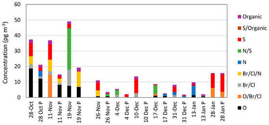 The RMAS has been further upgraded to include PTFE membranes upstream of two-in-line CEM and nylon membranes in three-stage filter packs. The PTFE membrane was added to allow for differentiating between PBM and GOM [55]. Figure 4 shows one set of data collected at the Nevada location with the PTFE membranes in one RMAS system, and no PTFE in a second RMAS. Hg concentrations on the nylon membranes with the upstream PTFE membrane were lower than the concentrations on the nylon membranes without the PTFE membrane. A few interesting observations from this work include that oxide compounds are found on both membranes, suggesting this form exists as both particulate and gaseous Hg compounds. Additionally, nitrogen and sulfur-based compounds were more likely to be associated with the aerosol phase; however, in some cases they were found on both nylon membranes.
