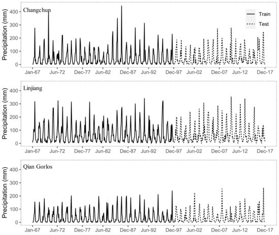 Time series of the observed monthly precipitation data during the training period of 1967–1997 and testing period of 1998–2017.