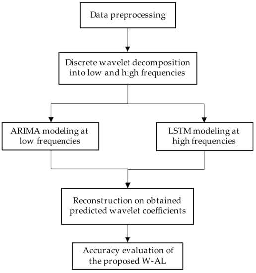 In time-series applications, although there are many available time series models, none of them can provide the best results in various situations. A large number of time series prediction studies have indicated that hybrid methods can improve prediction performance []. By making full use of the advantages of each method in the combination model, the error risk from using an inappropriate method is reduced, and more accurate results are obtained. In this study, we develop a new hybrid method for time series forecasting that combines the strengths of wavelet transformation, ARIMA and LSTM.