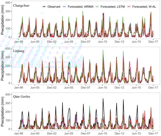 In the present research, the proposed W-AL was compared with the single ARIMA and LSTM models by adopting three statistical indicators for evaluating the performance of W-AL for predicting precipitation at the monthly scale and the results of the comparisons for the test stages are presented in Table 4. Performance comparisons of the best-fitted models indicated that W-AL was the best performer and was followed by LSTM and then ARIMA. For Changchun, the RMSE values ranged from 31.086 to 38.698, MAE from 22.215 to 25.256, and R2 from 0.578 to 0.728. For Linjiang, the RMSE values ranged from 35.772 to 42.739, MAE from 21.712 to 29.439, and R2 from 0.626 to 0.738. For Qian Gorlos, the RMSE values ranged from 27.064 to 37.535, MAE from 19.111 to 21.712, and R2 from 0.366 to 0.670. These results indicated that the best RMSE and MAE values were found for Qian Gorlos, while the best R2 value was found for Linjiang. However, RMSE and MAE values have limitations; that is, the same algorithm model that is utilized to predict monthly precipitation at different stations, cannot reflect the fitting effect of the model at different stations. Because the dimensions of the data are different at different stations, it is impossible to directly compare the predicted values, and it is impossible to determine the stations for which the model performs better. In contrast, R2 converts the predicted results into accuracies, and the results all fall between 0 and 1. For the prediction accuracies of different stations, it is possible to employ R2 to compare and determine which stations perform better. Based on this, it can be found that the fitting effect of the model was best in Linjiang with humid and semi-humid climate type and was worst in Qian Gorlos with arid and semi-arid climate type which revealed the model predicted better in humid region and worse in arid region.