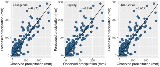 Scatter plots of observed and forecasted monthly precipitation for the W-AL model for the test period from 1998 to 2017.