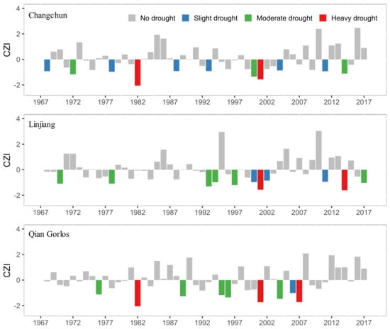 The drought index CZI results revealed that, drought events have become more frequent since 1987, and that all stations experienced some levels of drought in the 1980s, mid-2000s and early 2010s. On the other hand, the results indicated that there were more numerous slight drought events in Changchun and more numerous moderate drought events in Linjiang and Qian Gorlos.