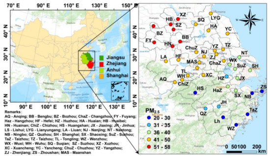 As one of the most densely populated regions, the YRD region, located in eastern China, has a population of over 150 million, accounting for 11% of the total population in China. It is also one of the most economically developed regions in China. The YRD region consists of Shanghai Municipality and three provinces, covering 41 prefecture-level cities, as shown in Figure 1. Nanjing, Hangzhou and Hefei are the capital cities of Jiangsu, Zhejiang and Anhui Provinces, respectively. Data of observed hourly PM2.5 concentrations can be obtained from the China Urban Air Quality Real-Time Publishing Platform (http://106.37.208.233:20035/), which was supported by the Ministry of Ecology and Environment of the People’s Republic of China (MEEP). The instrument operation and management, data quality assurance and quality control of these data are all performed in strict compliance with NAAQS guidelines (GB 3095-2012).
