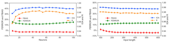 To ensure the robustness of the experiments of the OR-ELM-AR model, the impacts of the number of neurons and the length of input samples on the forecast performance were examined. With the increase of neuron numbers, FBIAS and FERROR increased, while IOA and R decrease, as shown in Figure 3 (left). The number of neurons, 25, was the optimum in both considerations of avoiding over-fitting and achieving satisfying operational efficiency. With the increase of input sample length, but less than 200, FBIAS, IOA and R slowly decreased while FERROR increased slowly, so we choose the parameter of input length as 200, which was enough to extract important information of the time-series and keep the model’s robustness [28].