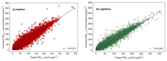 Scatter plots of forecasted and target fine particulate matter (PM2.5) concentrations based on the OR-ELM-AR during the daytime (a) and during the nighttime (b).