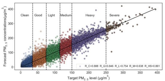 According to the technical regulations of the ambient air quality index (HJ 633–2012) issued by China government, air quality situations are classified into six categories: excellent, good, light, moderate, heavy and severe pollution. We evaluated the forecast performance at different pollution levels. Here, we combined heavy pollution and severe pollution into one group for forecast performance evaluation due to the limited number of severe pollution days. Generally, the forecast concentrations of the OR-ELM-AR algorithm were close to the target values for all pollution levels, as shown in Figure 5. From good to moderate pollution level, the R coefficient gradually decreased from 0.888 to 0.638 and then rose to 0.861 under heavy and severe conditions (Figure 5). This shows that the OR-ELM-AR model has slightly better adaptability at low and high levels of PM2.5 concentration compared with the intermediate pollution level.
