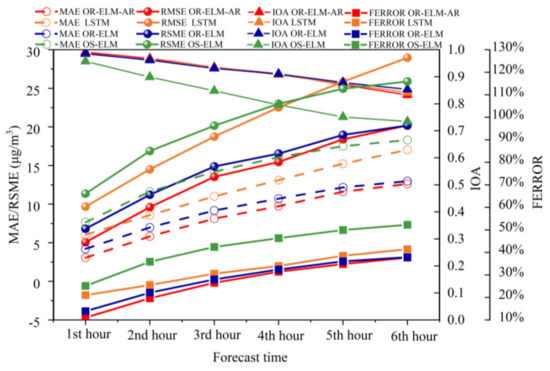 The forecast results of OR-ELM-AR were evaluated by comparing with the observed data based on several statistical metrics, including mean error (bias), mean absolute error (MAE), root-mean-squared error (RMSE), index of agreement (IOA), fractional bias (FBIAS), fractional error (FERROR) and correlation coefficient (R). Definitions of these metrics are shown in Table 1. In order to evaluate the robustness of forecast performances, these metrics were calculated for different cases: (1) at different forecasting time from the first hour to the sixth hour; (2) at different PM2.5 pollution levels; (3) during time periods of daytime and nighttime, respectively; (4) spatial distribution of forecast over the whole YRD region. In addition, LSTM, OS-ELM and OR-ELM were also used, and their performances were compared with OR-ELM-AR for better understanding the advantage of the OR-ELM-AR model in forecast ability [27].