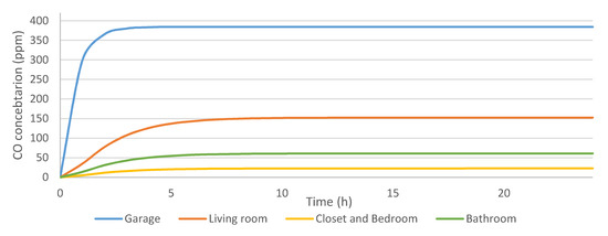 The coupled results between CONTAM and CFD0 are shown in Figure 8 and Figure 9. The results of the CFD simulations are directed to CONTAM, which uses the information for the multizone simulation of the house. Both in Figure 8 and Figure 9, the black dashed line represents the simulation done only in CONTAM without the CFD0 application as a basis for comparison. As is shown in these figures, the connection with the CFD program, as well as the change of placement of the furnace, alters the concentration on CO, not only in the garage, but also the amount of the contaminant that flows into the house.