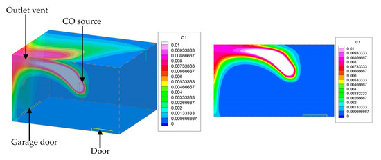 CO distribution in the garage—case 3 (concentration of CO in kg/kg).
