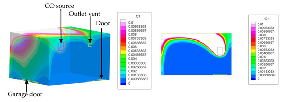 In the second case, the furnace was on the same wall exhaust vent—perpendicular in relation to the door to the house (opposite the garage door). The results are presented in Figure 5. Contaminants still flow into the house, but the majority flow directly into the outlet vent. Additionally, the majority of contaminants remain in one area of the garage and do not fill the room.