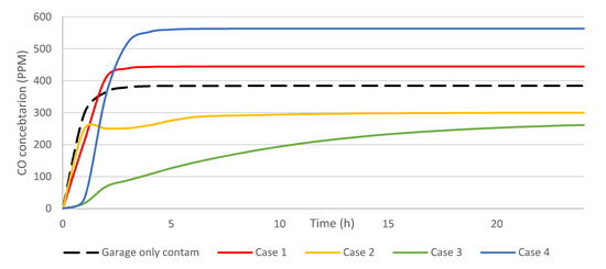 For the garage, as well as for the rest of the building, the worst case was case 4, where the furnace was on the opposite wall than the door to the house and the ventilation grill was on the same wall as the door to the house. The concentration in the garage grew up to 565 ppm and 165 ppm in the living room.