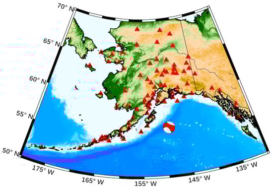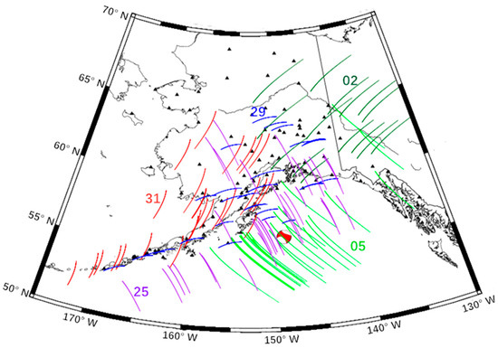 In this study, the STECs within 1 h around the seismic area of the Alaska earthquake, which are derived from the CORS GPS data at the sampling interval of 15 s, were used as the basis for detecting the CIDs after the Alaska earthquake. The CORS stations in Alaska were largely dense, providing sufficient data for subsequent research. The geographical distribution of approximately 81 CORS GPS tracking stations selected in the study is shown in Figure 1.