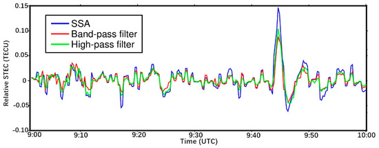 The CID amplitude caused by strike-slip earthquake is small [29,30,31]. The detailed information of CID propagation characteristics caused by strike-slip earthquakes is difficult to extract. The disturbance information of the time series extracted by filtering will leak the signal, causing signal loss when extracting the CID with small amplitude. We use SSA to process the time series to retain more details of the disturbance signal and to analyze the details of CID features caused by the strike-slip earthquake. Figure 2 shows the ionospheric disturbance information along LOS between the station av07 and GPS satellite 05 extracted by the SSA, band-pass filter (cutoffs of 2 mHz and 8 mHz) [28,45], and high-pass filter (cutoff of 2 mHz) [11,14]. The features of ionospheric disturbance extracted by SSA and band-pass filter were more detailed, and the signal processed by high-pass filter causes greater changes. The ionospheric disturbance peak amplitude extracted by SSA is larger than that extracted by band-pass filter and high-pass filter, and the signal amplitude extracted by the band-pass filter is very small. The detailed ionospheric disturbance information extracted by SSA helps to analyze the details of CID propagation characteristics.