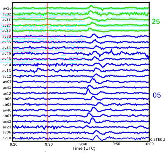 Figure 3 shows the information along LOSs between the stations near the epicenter and all the GPS satellites (02, 05, 25, 29, and 31) used for the analysis covered the ionospheric area around the epicenter during 9:00–10:00 UTC.