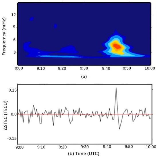 Figure 5. ΔSTEC (slant total electron content) time series in the sight line of av07 station to GPS satellite 05 and the corresponding spectrum during 9:00–10:00 UTC. (a) Frequency domain distribution diagram; (b) time domain distribution.