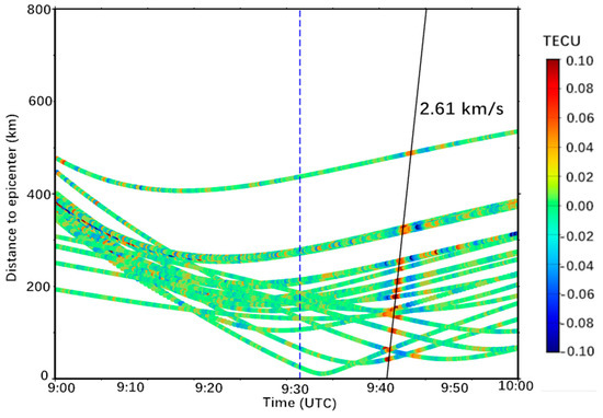 Figure 6. Distance-time diagram of the ionospheric disturbance sequence following the Alaska earthquake, the blue line indicates the time of the earthquake, and the black line represents the trend line fitted according to the peaks of co-seismic ionospheric disturbances (CIDs).