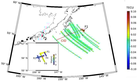 Strike-slip fault-dominated earthquakes have a smaller rupture magnitude than thrust earthquakes, and horizontal slip is the main source of displacement [28]. The detailed horizontal slip segment of the Alaska earthquake was used to analyze the propagation characteristics of the CID. Figure 7 shows that the horizontal propagation direction CID of the Alaska earthquake was consistent with the west-southwest direction of maximum slip segment F1. Co-seismic displacement is particularly important to the generation of CID, and the maximum co-seismic displacement of the Alaska earthquake is caused by the slip segment F1 [34]. The CID spread to the south of the epicenter due to the effect of the geomagnetic field on the plasma [13]. These results indicate that the propagation of the CID in the southwest direction was not only affected by the geomagnetic field, but may also be related to the horizontal sliding direction of the fault. The CID caused by the other main sliding segment F3 was not detected during 9:30–10:00 UTC. This may be due to the fact that the CID has a tendency to spread southward due to the influence of the geomagnetic field and the direction of the sliding segment F3, while the distribution of SIPs in the south of the epicenter was lacking within half an hour after the Alaska earthquake. The CID direction of earthquakes dominated by strike-slip faults may be affected by the horizontal sliding direction of the fault.
