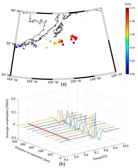 The source location was determined by selecting a known CID and using ray tracing technique [19]. The ray tracing technique assumes that the seismic wave propagates to the height of the ionosphere in the vertical direction and then propagates around the horizontal direction at the velocity of the CID. From the given velocity model, the CID origin position was calculated from the CID position and velocity information. The search range of the CID source was given between 50°–60° N, 140°–155° W. At a given horizontal propagation velocity V H of the CID, an offset of 0.1° × 0.1° was used as the assumed CID source location, and the occurrence time of the CID source was expressed as [19]: