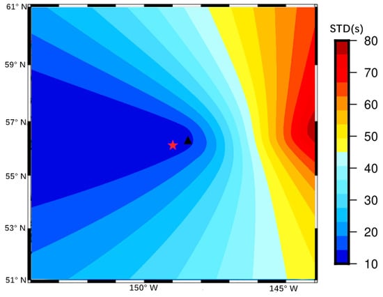 Figure 9. CID source location of the Alaska earthquake, the black triangle represents the CID source location, the red star represents the actual epicenter location, and color depth represents standard deviation (STD).
