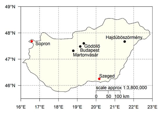 Data collection is performed by the authors of this study. The cities chosen represent the places of residence of the authors, except the cities of Sopron and Szeged. The cities of Sopron and Szeged are chosen because of their thermal contrast. Sopron belongs among the coldest, whilst Szeged among the warmest, cities in the country.