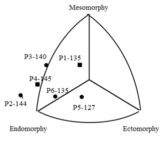 Person 2 and Person 4 have a typical endomorph body shape with increased skeleton–muscular robusticity. Person 1 and Person 3 have a mesomorph–endomorph body shape; this type of somatotype category is characterized by the dominance of both endo- and mesomorphy components, namely, increased body fatness and increased skeleton–muscular robusticity. However, Person 1′s somatotype reveals less extremity in endomorphy and mesomorphy; his somatotype is very close to the central somatotype, in which the three components form the body shape equally (Figure 2, Table 2). Person 5′s somatotype is ectomorph–endomorph; in her case, the normal limb–trunk ratio and the normal level of body fatness exist with decreased skeleton–muscular development. Person 6′s somatotype is also endomorph, but in this case, it is a balanced endomorph, when relative fatness is dominant in the body shape and linearity and skeleton–muscular robusticity are equally underdeveloped.