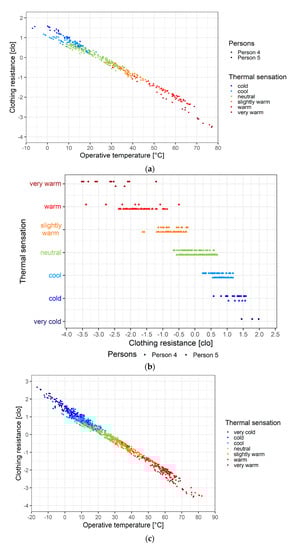 Thermal sensation–thermal load dependence can also be analyzed by presenting the thermal sensation–rcl point-cloud; this is given in Figure 3b. The points denoted by squares and circles refer to human 4 and 5, respectively. As we expected, the overlap between the rcl values of human 4 and 5 is good for the thermal sensation categories “neutral”, “cool” and “slightly warm”. The same overlap is much weaker for the thermal sensation categories “very warm”, “warm” and “cold”. There are also transitional rcl values, when adjacent thermal categories can equally happen. For instance, for human 5, thermal categories “neutral” and “cool” for 0.2 clo < rcl < 0.5 clo, thermal categories “cool” and “cold” for 0.6 clo < rcl < 1.2 clo, thermal categories “slightly warm” and “warm” for −1.2 clo < rcl < −0.5 clo and thermal categories “very warm” and “warm” for −3.5 clo < rcl < −2.0 clo.