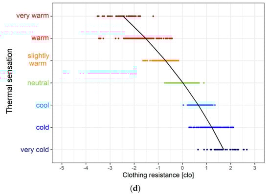 The thermal sensation–rcl dependence for all Hungarian persons considered is presented in Figure 3d.