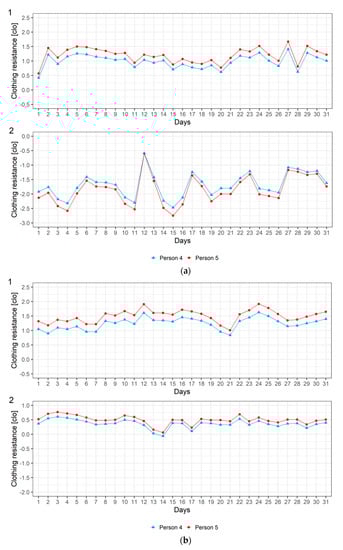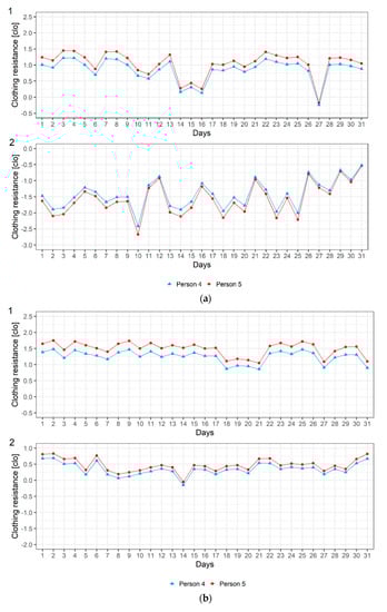 (a) Evolution of the thermal load at noon (12 UTC) for humans 4 and 5 over 31-day winter (1) and summer (2) season periods in the city of Szeged; (b) Evolution of the thermal load in the early morning (4–6 UTC) for humans 4 and 5 over 31-day winter (1) and summer (2) season periods in the city of Szeged.