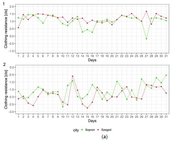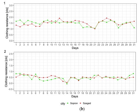 The variation of weather in 31-day winter and summer season periods separately at noon and early in the morning for the city of Sopron in terms of clothing resistance is presented in Figure 4a,b, respectively. As mentioned, thermal load is represented for humans 4 and 5. In the Hungarian lowland, typical winter mean clothing resistance values of an “average Hungarian female” are between 1.4 and 1.6 clo []. The fluctuations registered in Sopron in the winter period at noon (Figure 4(a1)) in most of the cases are very close to these values. This is mostly sensed by humans 4 and 5 as “cold”, only in some cases as “cool”. Nevertheless, there are also warmer cases (days 14, 15, 16 and 27), when the rcl values are between +0.5 and −0.5 clo. At noon on 8 January 2019 (case 27), the outdoor environment’s operative temperature (25.7 °C) was much higher than the air temperature (air temperature 0 °C) because of greater global radiation (373 Wm−2) and gentle wind (0.8 ms−1). This is sensed by both humans as “neutral”. Typical summer mean clothing resistance values in the Hungarian lowland are around 0 clo []; consequently, the corresponding thermal sensation is “neutral”. However, at noon in summer, the thermal load can be much larger depending on radiation and wind speed conditions. This can be seen in the example of the city of Sopron (Figure 4(a2)). rcl fluctuates between −0.5 and −2.5 clo, but in the majority of the cases rcl is lower than −1 clo. The corresponding thermal sensations vary from “neutral” (rcl values above −0.5 clo) through “slightly warm” (rcl values around −1 clo) to “warm” (rcl values around −1.5 clo) or “very warm” (rcl values towards −2.5 clo). The strongest thermal load was on the 10th day (21 June 2019), the weakest thermal load was on the 31st day (13 July 2019).