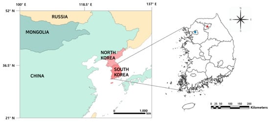 Sampling site used in this study. Location of South Korea (left). Map of South Korea (right). Red star indicates the location of the PM2.5 sampling site in Chuncheon, and the blue circle indicates the national ambient air quality monitoring station in Seoul.