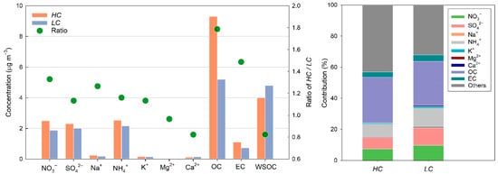 Concentrations of PM2.5 components (left) and the fraction of each component in the PM2.5 mass (right) for HC and LC samples. Green circles in the left plot indicate the concentration ratios of HC to LC samples for each PM2.5 component.