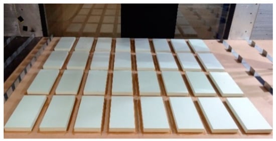 The experiments were conducted in an open-circuit low-speed wind tunnel, which is in the Laboratory of Environmental Aerodynamics of the Institute of Thermomechanics, in 2020. In the wind tunnel, an atmospheric boundary layer at a 1:400 scale with a neutral stratification similar to the one found in cities was modeled utilizing spires and roughness elements in the development section. The characteristics of the modeled boundary layer correspond to the Verein Deutcher Ingenier (VDI) requirements for these environments []—Table 1. The same boundary layer was utilized in [,,,,]. The vertical profiles of the mean velocity and the intensity of turbulence of the velocity component along the main wind direction at the inlet section can be found in []. Into the wind tunnel test section, a model at the scale of 1:400 was placed. The model consisted of rectangular buildings (150 × 300 × 30 mm) with flat roofs positioned equidistantly from each other (50 mm, Figure 1). In contrast with [,,,,], the model height is lower; the model houses do not have pitched roofs and no courtyards are present.