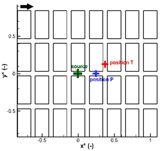 Layout of the model with the sampling positions (position P, T) and the gas source position represented by the crosses. The arrow direction is the direction of the main flow.