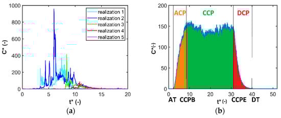 When the toxic gas cloud is released, it is being dispersed by the ambient air. By placing a detector at a location exposed by the release, one can see a cloud front, in which gas is usually extensively diluted with ambient clean air (arrival cloud phase—ACP). The reason for the dilution may be the smaller eddies (compared to the cloud size) positioned between the cloud’s leading edge and the ambient clean air. Then, a central cloud phase (CCP), in which the densest cloud part is present, reaches the aforementioned location. When the cloud already leaves the observed position (departure cloud phase—DCP), the cloud trailing edge is diluted again, and gas concentration decreases until the cloud is definitively out of the detector position. Unfortunately, these cloud phases are hard to recognize in the concentration time series looking at an experiment realization of the release due to the turbulent wind (Figure 3a). One can see to what extent the concentration time evolution observed at a fixed position can differ. This difference can be seen for various signal characteristics—e.g., the arrival time of the cloud (for the realization 1 AT ≈ 3, for the realization 4 AT ≈ 9), maximum concentration (for the realization 2 max ≈ 950, for the realization 4 max ≈ 50), the time interval when the cloud was present at the detection position (for the realization 2 Δcloud presence ≈ 15, for the realization 4 Δcloud presence ≈ 5). On top of this, the cloud does not even have to come to the detection position (see realization 5). However, by conducting a large number of release realizations under the same mean ambient and release conditions, a mean cloud behavior can be calculated. The individual cloud phases are much easier to be recognized in this mean concentration signal (Figure 3b).