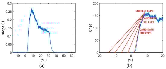 The switching time can be found connecting two points of the concentration time series with a segment line and looking at its slope. The first fixed point of the line segment is a point positioned in time before the arrival time whose exact position must be further particularized (see the paragraph below). The second point is gradually chosen as a point of the time series from the arrival time to the departure time and, for each segment line, its slope is calculated. The line slope generally increases forming a peak and then starts to decline. The maximum of these slopes is the candidate for the beginning of CCP (CCPB) (Figure 4a).
