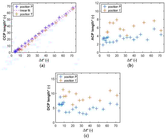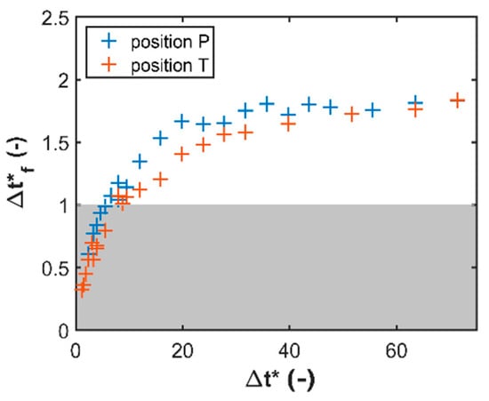 The lengths of individual cloud phases are plotted in Figure 5. The CCP length, ascertained from the ensemble mean concentration time series, increased linearly with the increase in the release duration Δt*. Moreover, the release duration from which CCP should be detectable can be found by utilizing the fitted line. The fitting could be negatively influenced by the values for the release durations lower than six for which the CCP length is zero or a small positive value for position T. Hence, these results were excluded from the analysis. The linear regression revealed that CCP should be recognizable in the mean concentration time series from the release duration Δt* = 2.6 ± 0.6 for position P and Δt* = 6 ± 2 for position T. These values might be the candidates for the switching duration between the plume and puff dispersion types. It can be seen that these values depend on the detection position, which contradicts the hypothesis that the value 1 h of the Van der Hoven energy spectrum gap might be the searched value []. Compared to the Pasquill and Smith hypothesis [], which determines the switching release duration as the cloud travel time from the source to the sampling position, the found values are, especially for position P, lower. The phase is shorter at position T than at position P for the same release duration since the cloud is more diffused in the position further from the source and the dense cloud part is therefore smaller.