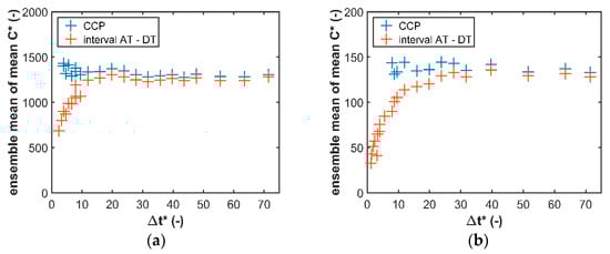 Figure 6 can be used for the evaluation of the influence of the cloud edges—ACP and DCP—on the entire cloud (time interval AT–DT). The graph shows that the mean values calculated from the time interval AT–DT increase until a state of saturation was reached. A huge difference between the values of CCP and the entire cloud is seen for small release durations. Hence, the extraction of CCP from the entire puff is significant for the resultant value for these release durations. However, moving towards high release durations, this difference becomes very small, even though the values are still very slowly getting closer to each other.