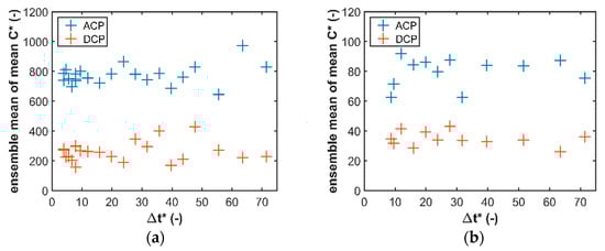 The ensemble mean of the mean ACP concentrations is independent of the release duration (Figure 7). Its value is 800 ± 200 for position P and 80 ± 20 for position T. The ensemble mean of the mean DCP concentrations is also independent of the release duration with its mean value 300 ± 100 for position P and 36 ± 7 for position T. These findings of the cloud edges’ independence from the release duration are in agreement with the modeling approach of the ADMS model []. The values of ACP generally tend to be higher than the values of DCP. The reason for this is that the DCP length tends to be longer than the ACP length. One can see a typical tail observable as a steep decrease in concentration slowing down into a curve shaped like an arch (Figure 3b). The concentrations in this region are still not that of the background level but are relatively low.