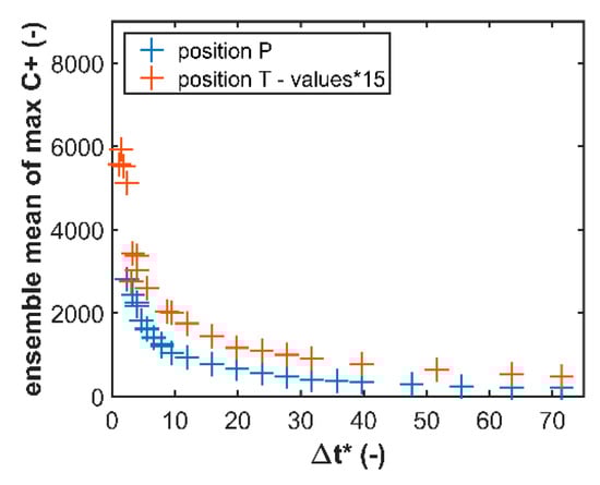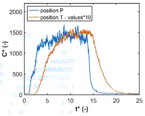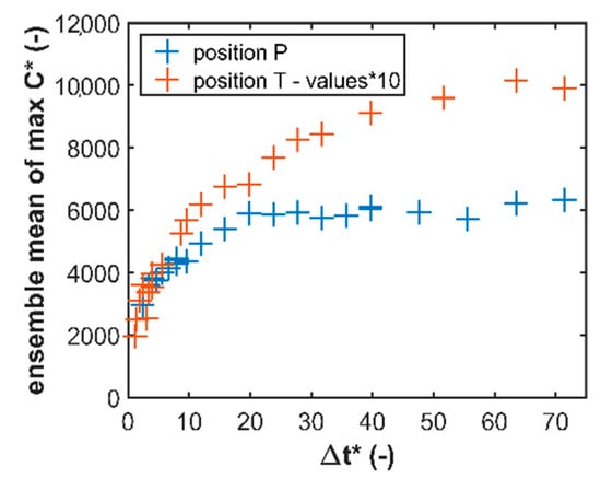 Robins and Fackrell [] report that the plateau region becomes clear when constancy of the ensemble mean of maximum concentration is reached. For our measurements, however, the plateau region was observed, especially at position T, much earlier (Figure 9). One can see that the constancy of the values is reached approximately for the release duration Δ = 20 for the position P (60 for the position T) in Figure 8 but Figure 9 illustrates that even the release of the duration Δ = 12 has a visible plateau region for both positions. The reason for the different behavior with the compared study could be the different conditions for gas dispersion in the surrounding environment—the presence of obstacles in contrast with the compared study. The buildings cause the cloud to distort and gas to be redistributed, which might result in the possibility of seeing the plateau region for the shorter release durations.