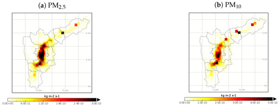 Local particulate matter emission inventories for the Aburrá Valley: (a) PM2.5, and (b) PM10. The values correspond with the estimated annual emissions.