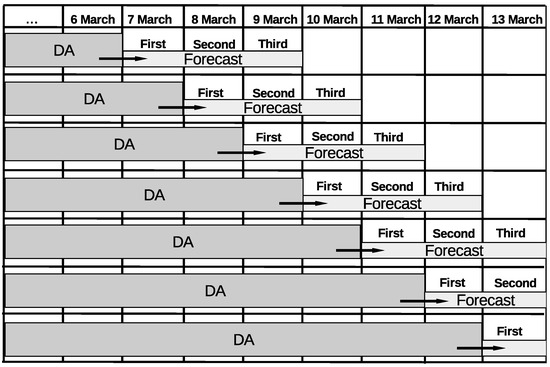Graphic explanation of the experimental forecast setup. The arrows represent the inheritance of the last correction factor 24-hourly profile into the forecast. All simulations start at 23 February 19:00 UTC-5. A spin-up period consisting of the 5 days prior to the start date was used for each simulation.