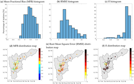 Evaluation of low-costs network against the official monitoring network for the period between 25 February 2019 and 15 March 2019. Panels (a–c) show the histograms of the MFB, RMSE and R respectively. Panels (d–f) show the MFB, RMSE and R values of each evaluated sensor.