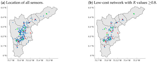 The performance of 145 sensors from the low-cost network was evaluated against data from the official network. The remaining 110 sensors did not have an official monitoring station within a 2-km radius. Figure 5 shows the histograms of the MFB, RMSE and R, and the geographical distribution of the performance values. For the majority (67%) of the low-cost sensors an MFB between −0.25 and 0.25 was obtained, with an average of about 0.2. The average RMSE was close to 8 μg/m3, with most sensors presenting values below 15 μg/m3. The majority (88%) of the sensors showed correlations with R values above 0.7. Observed errors fell within acceptable ranges (as in [21,22]). Zonal differences in measurement errors were observed. Locations in the South-central part of the city of Medellín (green ellipse on Figure 5 d–f) contained most of the sensors with a R values lower than 0.5 and RMSE values grater than 15 μg/m3. Those sensors were located in a dense urban area, while the closest monitoring station is located in the outskirts of the city. Figure 6 shows the spatial distribution of the complete low-cost network and the subset of 115 low-cost sensors with the highest quality data (as defined in Section 2.3). The selection of the low-cost high quality stations was based on the results shown in Figure 5b,e.