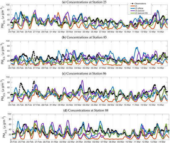 Temporal series of PM2.5 concentrations from selected validation stations of the official network (a)–(d), LOTOS-EUROS without assimilation, LE-official, LE-lowcost and LE-lowcost-HQ. Time stamps are valid for local time (UTC-5). A spin-up period consisting of the 5 days prior to the start date was used for each simulation.