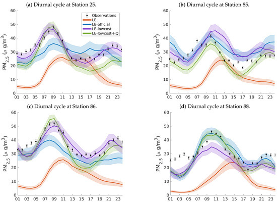 Diurnal cycle of PM2.5 concentrations from selection stations of the official network (a–d), LOTOS-EUROS without assimilation, LE-official, LE-lowcost and LE-lowcost-HQ. The bars and the shadows represent the standard deviation over the simulation period. The time stamps are valid for local time (UTC-5).