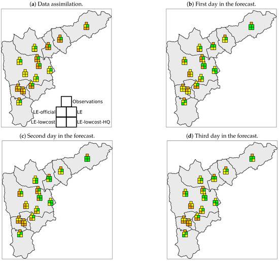 Although the LE-lowcost simulation used more observations than the LE-lowcost-HQ simulation (255 and 115, respectively), the location and quality of the additional observations played an important role. The LE-lowcost-HQ was defined using a high similarity criterion to the official network, so it was not as affected by observations with low quality as LE-lowcost. Comparisons between Figure 6a,b revealed that the additional locations do not increase the spacial density considerably relative to the high-quality low-cost subset. Our results suggest that while a high observation density is essential for improving the performance of a model with data assimilation, it is crucial to consider other factors such as the quality of the data and the location of the sensors. Different techniques of observation localization allow optimizing the number of sensors to improve the data assimilation or other data fusion techniques [41,42,43,44]. We highly recommend implementing these techniques in the development of new low-cost monitoring networks. Apart from minimizing the number of sensors and associated costs, the processing of a reduced number of observations requires less computational resources. As an example, the LE-lowcost simulation was 3.2 times slower than the LE-lowcost-HQ using the same computation configuration. Optimization of computational and time resources are especially important for operational systems.