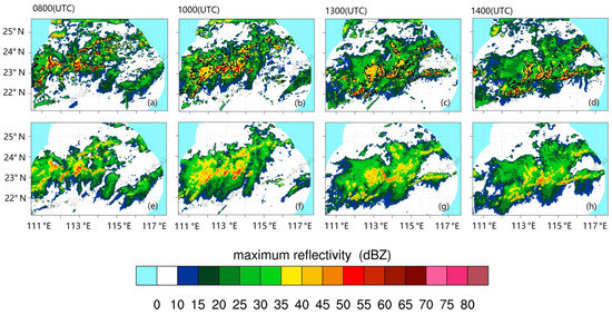 Composite radar reflectivity (dBZ) at (a,e) 0800 UTC; (b,f) 1000 UTC; (c,g) 1300 UTC; (d,h) 1400 UTC. (a–d) are from the simulations, and (e–h) are from the observations. The 35 dBZ reflectivity contours from the observations are shown in the panels of the correspondent simulations (in thick black). The areas out of the radar detection ranges are shown as light blue shades.